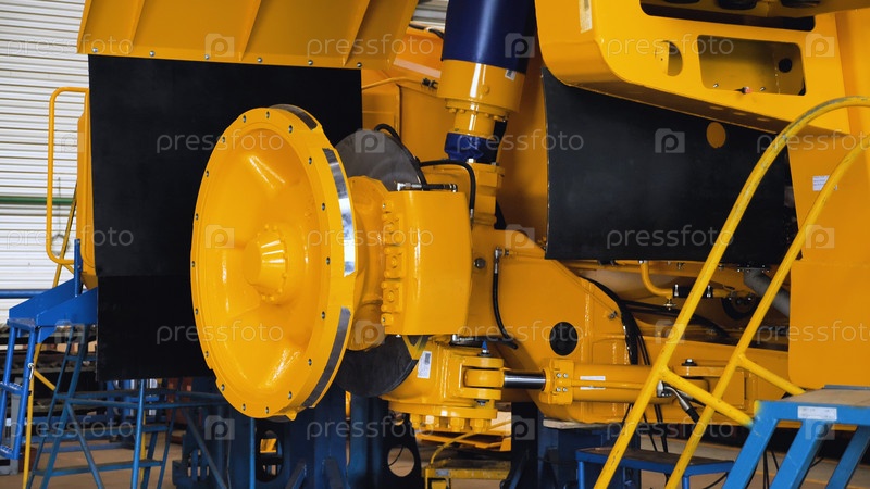 Тормозной диск с суппортами на сборочной линии самосвалов в цехе по производству больших желтых карьерных самосвалов. Цех завода. Крупный план