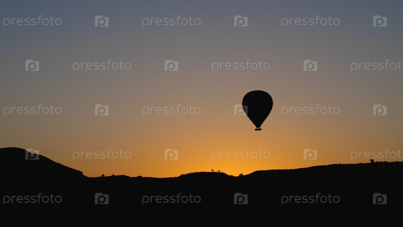 Силуэты воздушного шара, парящего над горным хребтом. На фоне предрассветного неба. Солнце вот-вот выйдет из-за горы. Кинематографический кадр полета на воздушном шаре