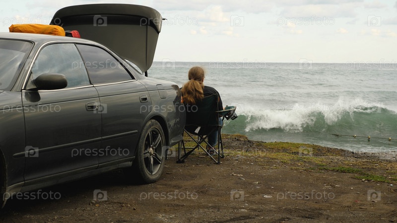 Женщина сидит на стуле возле машины у моря. Перед ней бушует море. Вид сзади. Большие волны. Пасмурное утро. Дорожное путешествие. Красивый вид на залив