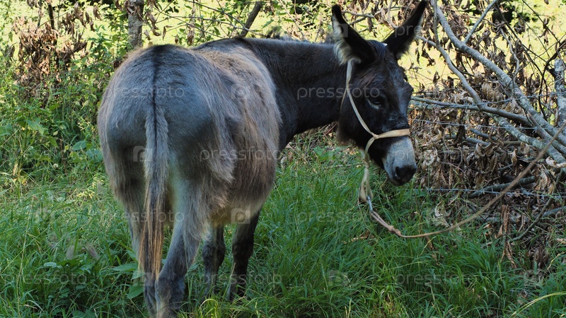 Одинокий осел стоит на солнечном зеленом поле, его мех насыщенно-коричневого цвета. Он кажется мирным и довольным, олицетворяя спокойствие сельской жизни