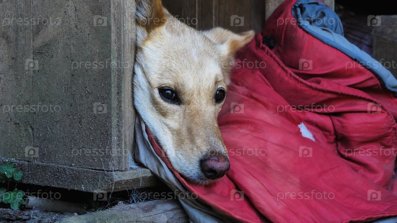 Собака уютно устроилась на красном одеяле в будке. Крупный план головы серой собаки