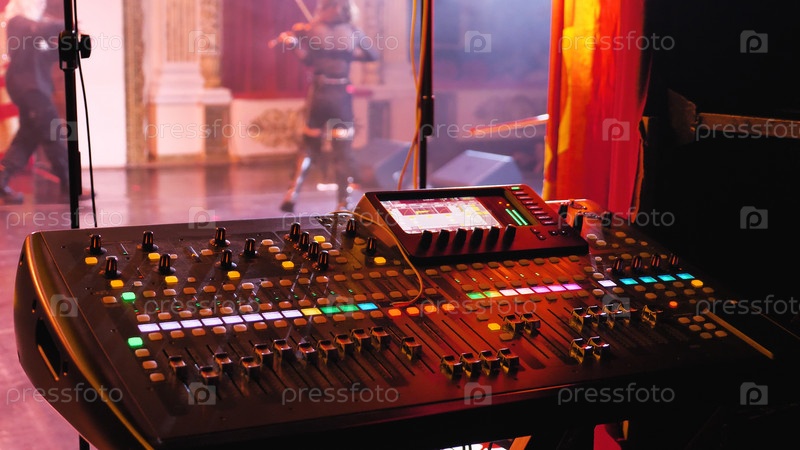 Микшер на концерте для регулировки уровней звука различных элементов, голосов и инструментов. Множество ручек и ползунков на микшере