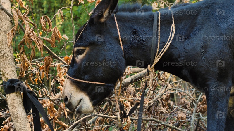 Черный осел с гладкой шерстью привязан к голому дереву в сельской местности или на природе. Сухая, увядшая листва указывает на отсутствие вегетационного периода или сухой климат