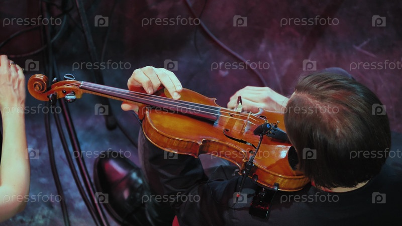 Музыкант держит скрипку под подбородком и проводит смычком по струнам, концентрируясь на игре. Вид сзади сверху