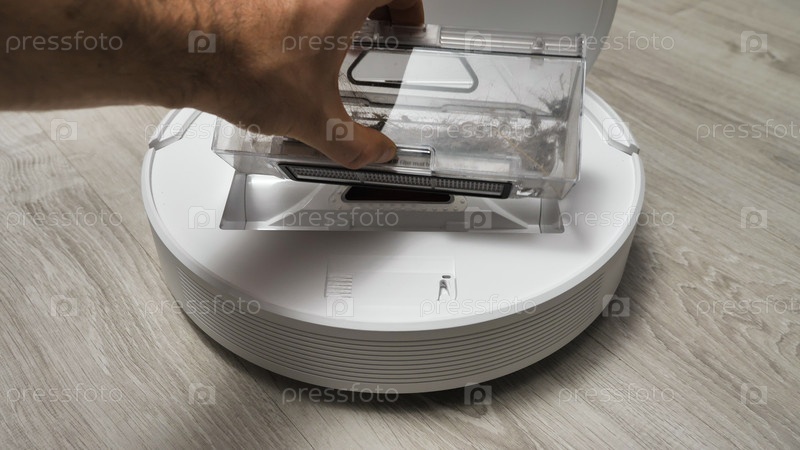 Рука мужчины достает контейнер с мусором из робота-пылесоса. Робот-пылесос на светлом полу, предназначенный для автоматической уборки