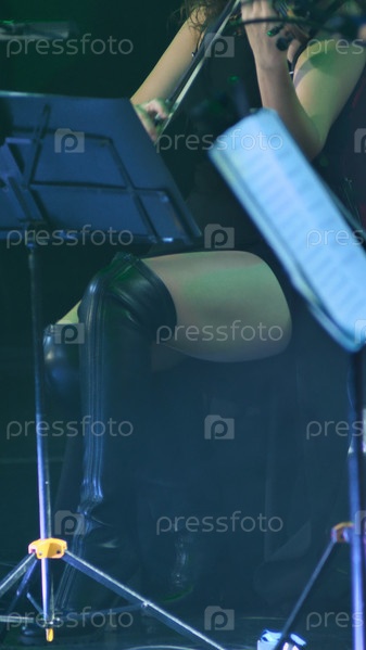 Скрипач во время живого выступления с акцентом на нижнюю часть тела, черные высокие самоги и обнаженную ногу. Живое выступление скрипача