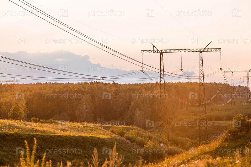 Линии электропередачи (линии электропередачи) на стальных опорах на фоне вечернего закатного неба