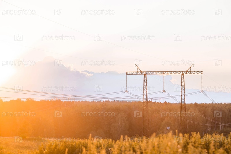 Линии электропередачи (линии электропередачи) на стальных опорах на фоне вечернего закатного неба