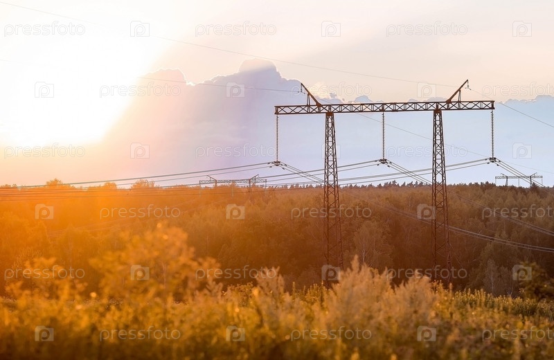 Линии электропередачи (линии электропередачи) на стальных опорах на фоне вечернего закатного неба