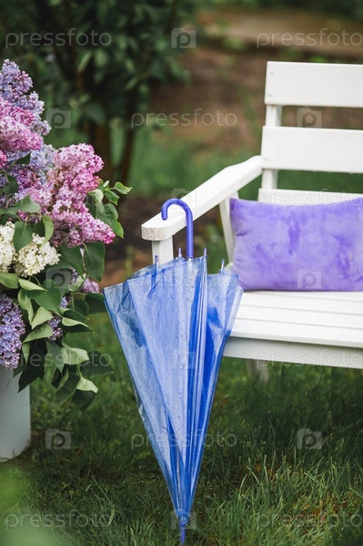 Весна. Декор. Красивые букеты сирени, белая скамейка и зонтик от дождя в весеннем саду. Красивая открытка для печати. Понятие весны и праздника