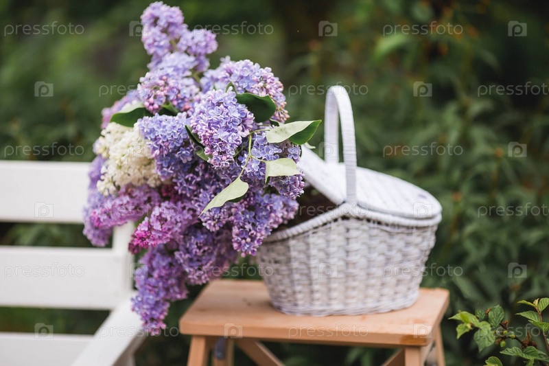 Весна. Декор. Красивые букеты сирени в плетеной корзине из виноградной лозы на белой скамейке в весеннем саду. Красивая открытка для печати. Понятие весны и праздника
