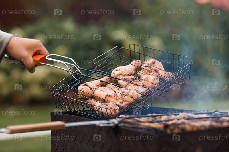 Барбекю на даче. Майские праздники. Барбекю на природе. Процесс приготовления мяса на гриле, крупный план. Шашлык из птицы на металлическом гриле. Куриные крылышки и ножки