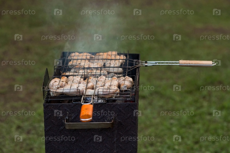 Барбекю на даче. Майские праздники. Барбекю на природе. Процесс приготовления мяса на гриле, крупный план. Шашлык из птицы на металлическом гриле. Куриные крылышки и ножки