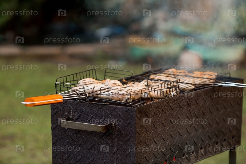 Барбекю на даче. Майские праздники. Барбекю на природе. Процесс приготовления мяса на гриле, крупный план. Шашлык из птицы на металлическом гриле. Куриные крылышки и ножки