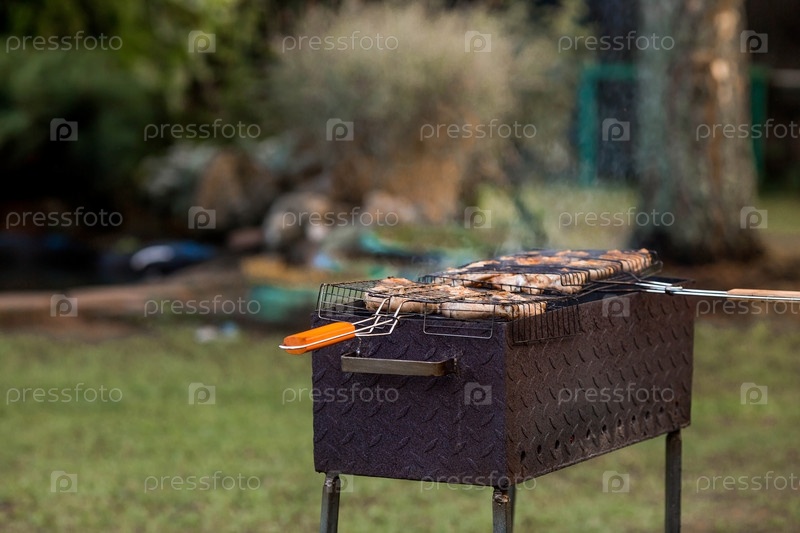 Барбекю на даче. Майские праздники. Барбекю на природе. Процесс приготовления мяса на гриле, крупный план. Шашлык из птицы на металлическом гриле. Куриные крылышки и ножки