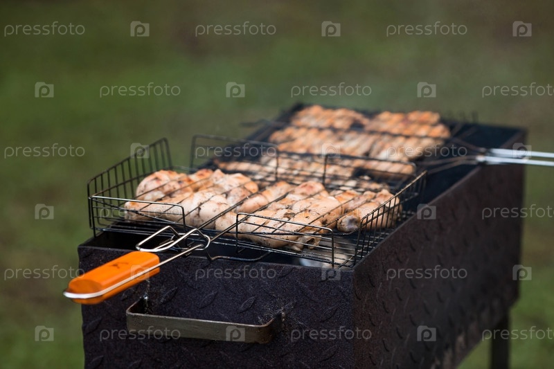 Барбекю на даче. Майские праздники. Барбекю на природе. Процесс приготовления мяса на гриле, крупный план. Шашлык из птицы на металлическом гриле. Куриные крылышки и ножки