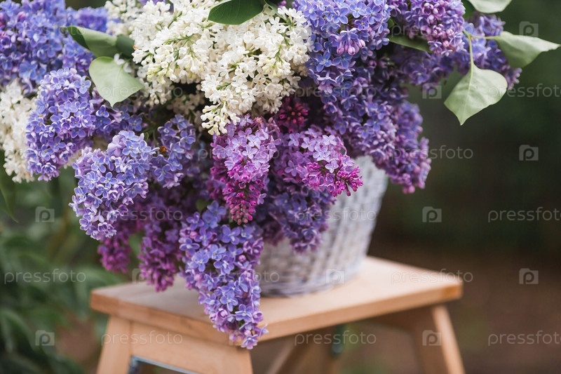 Весна. Декор. Красивые букеты сирени в плетеной корзине из виноградной лозы на белой скамейке в весеннем саду. Красивая открытка для печати. Понятие весны и праздника