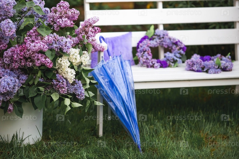 Весна. Декор. Красивые букеты сирени, белая скамейка и зонтик от дождя в весеннем саду. Красивая открытка для печати. Понятие весны и праздника