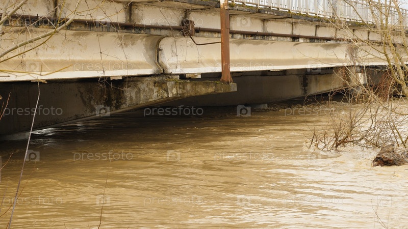 Критический уровень воды в реке. Наводнение. Вода поднялась до верха автомобильного моста. Стихийное бедствие, экстремальные погодные условия. Погодный катаклизм. Проблема глобального потепления