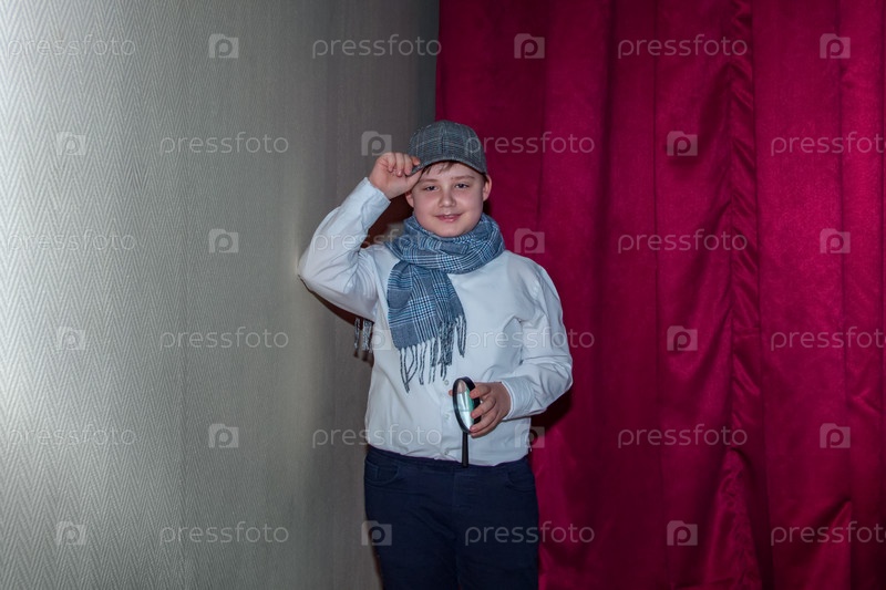 Милый подросток в кепке и клетчатом шарфе. Образ детектива. Увеличительное стекло в руке