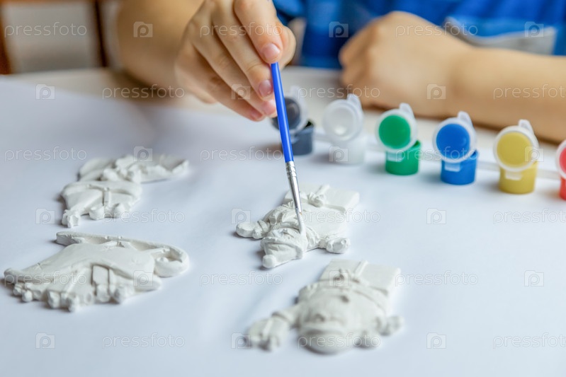 Малыш рисует и раскрашивает гипсовые фигурки кистью и гуашью на листе бумаги