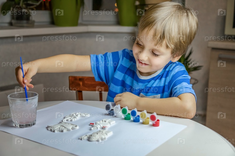 Малыш рисует и раскрашивает гипсовые фигурки кистью и гуашью на листе бумаги