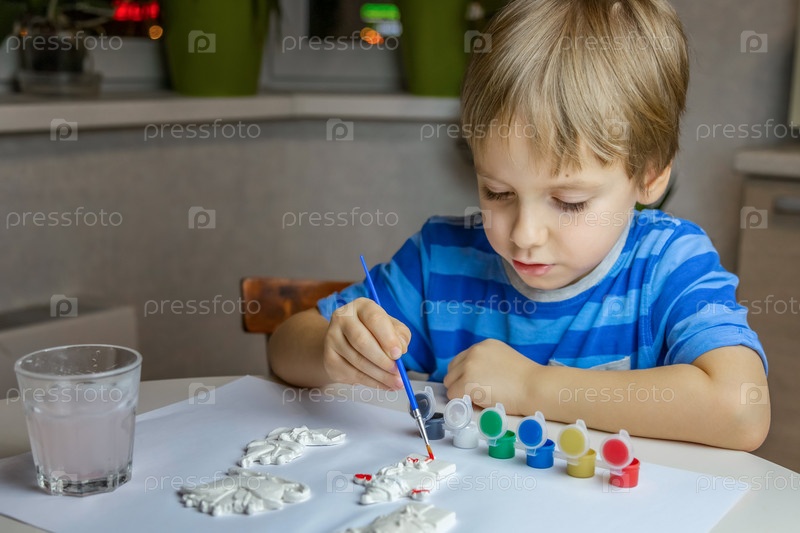 Малыш рисует и раскрашивает гипсовые фигурки кистью и гуашью на листе бумаги