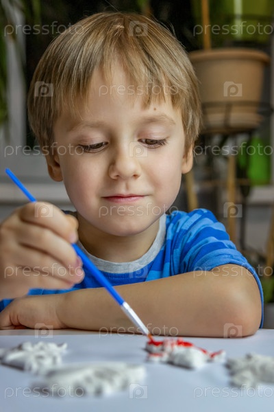 Малыш рисует и раскрашивает гипсовые фигурки кистью и гуашью на листе бумаги
