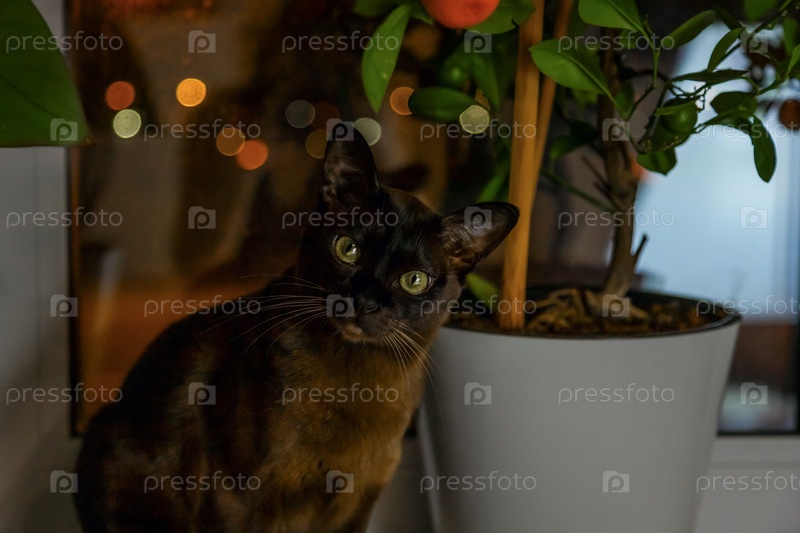 Настоящий взрослый коричневый кот на окне среди растений в вечернем свете