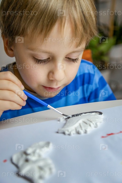 Малыш рисует и раскрашивает гипсовые фигурки кистью и гуашью на листе бумаги
