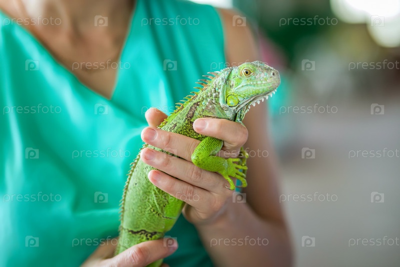 Зеленая игуана крупным планом, животное крупным планом в руках человека