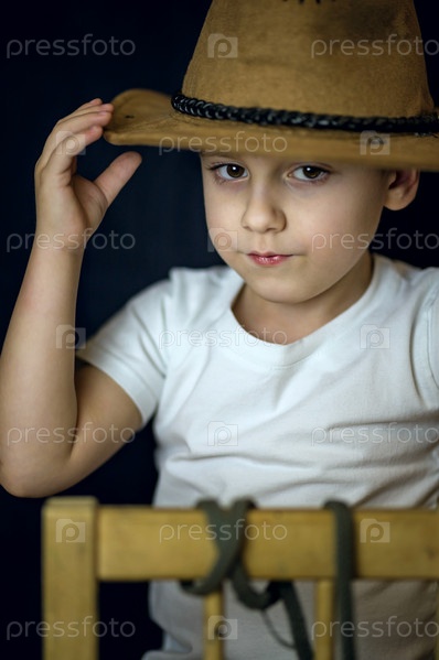 Краткий портрет европейского мальчика. Портрет на темном фоне мальчика в ковбойской шляпе и белой футболке