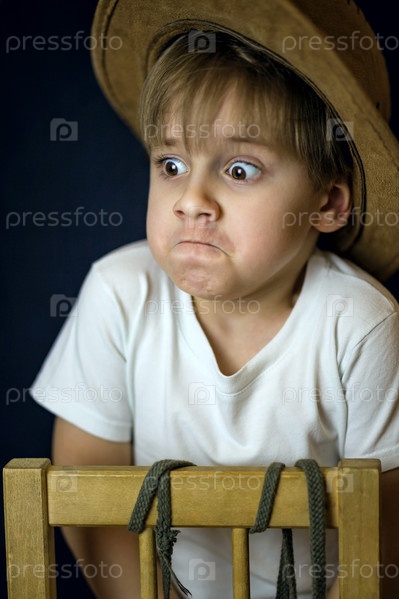 Краткий портрет европейского мальчика. Портрет на темном фоне мальчика в ковбойской шляпе и белой футболке