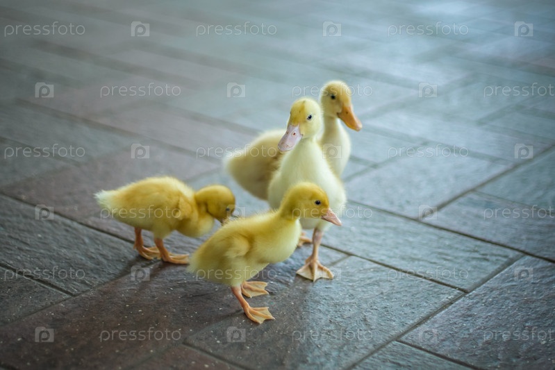 Утки дома. Светлые и темные утята свободно гуляют. Крупный план, вид сверху, группа очаровательных маленьких желтых утят