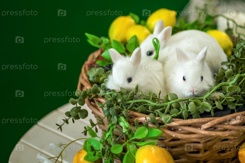 Симпатичные белые кролики сидят в плетеной корзине. Декор украшен цветами и лимонами. Место для текста