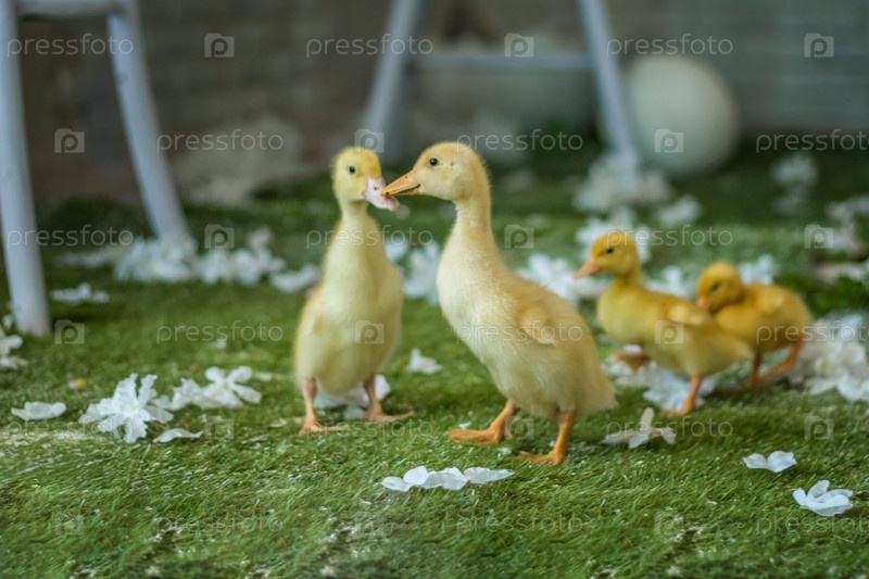 Утки дома. Светлые и темные утята свободно гуляют. Крупный план, вид сверху, группа очаровательных маленьких желтых утят