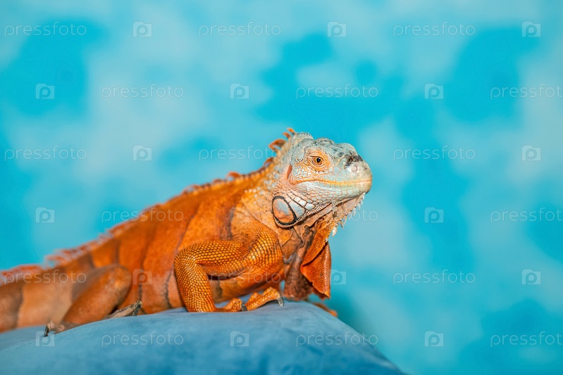 Оранжевая игуана на синем фоне. Ящерица
