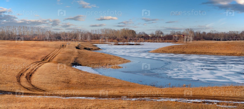 Россия, Юг Восточной Сибири. Вид на замерзшее озеро ранним весенним утром вдоль федеральной автотрассы Сибирь