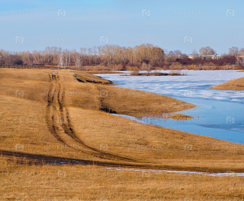 Россия, Юг Восточной Сибири. Вид на замерзшее озеро ранним весенним утром вдоль федеральной автотрассы Сибирь