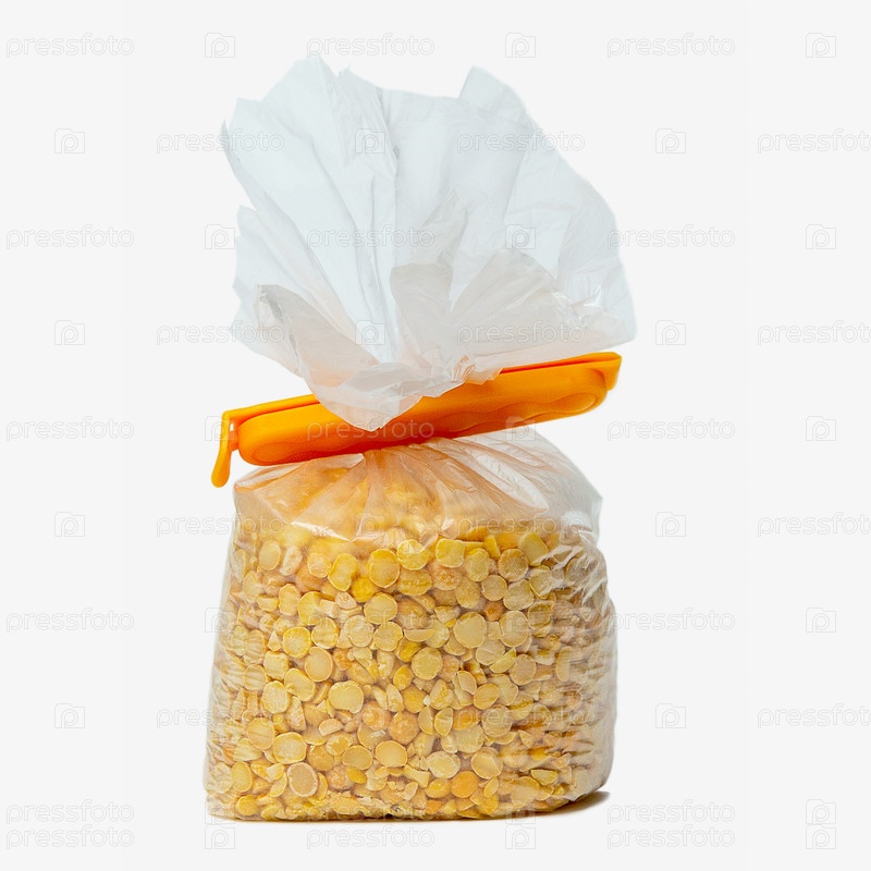 Колотый горох в полиэтиленовом пакете из пищевой пленки с зажимом для пакетов оранжевого цвета на белом фоне. Хранение на кухне