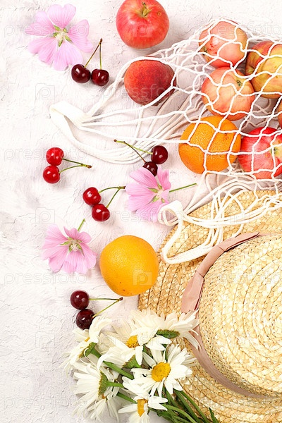 Летний модный баннер на ярком фоне. Соломенная шляпа, фрукты и ягоды в эко-сумке и цветы ромашки на солнечном столе. Концепция отдыха и путешествий, кемпинг на открытом воздухе и праздничная вечеринка,
