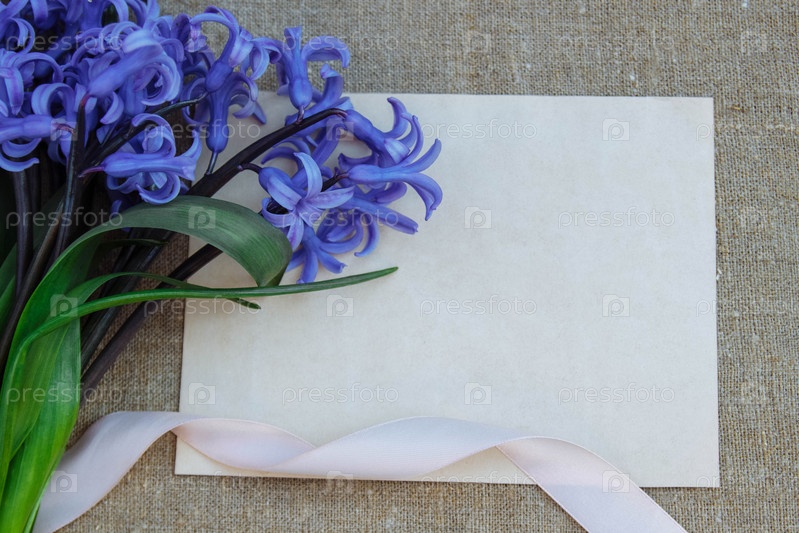 Букет синего гиацинта с лентой и чистый лист бумаги с пустым местом для текста, место для копирования, плоский вид на столешницу, вид на винтажную льняную скатерть