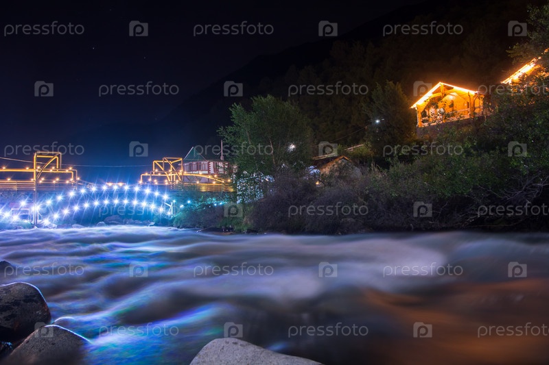 Горная река Аламедин ночью на фоне освещенного моста