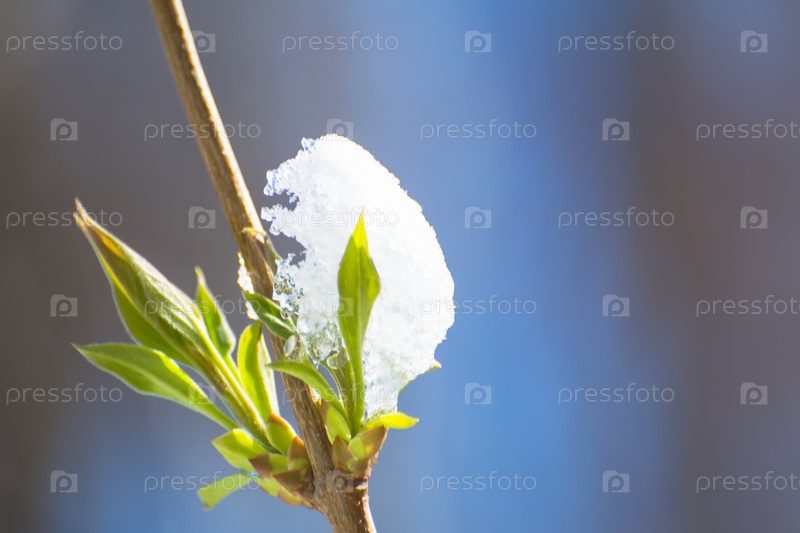 Весенние зеленые листья под снегом, мороз