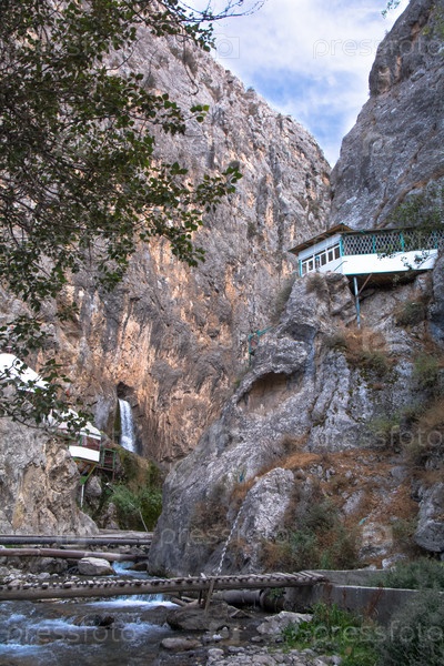 Водопад, выходящий из скалы в Ошской области Кыргызстана