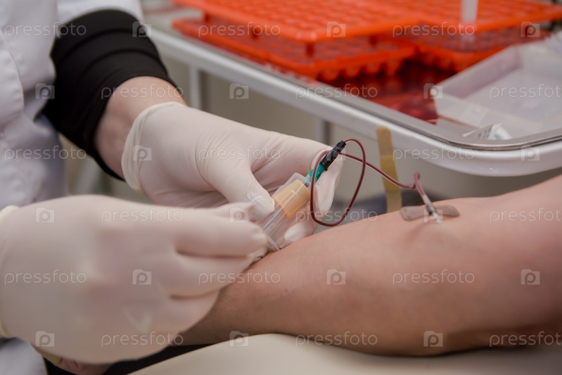 Врач берет кровь из вены у пациента с помощью системы для анализа