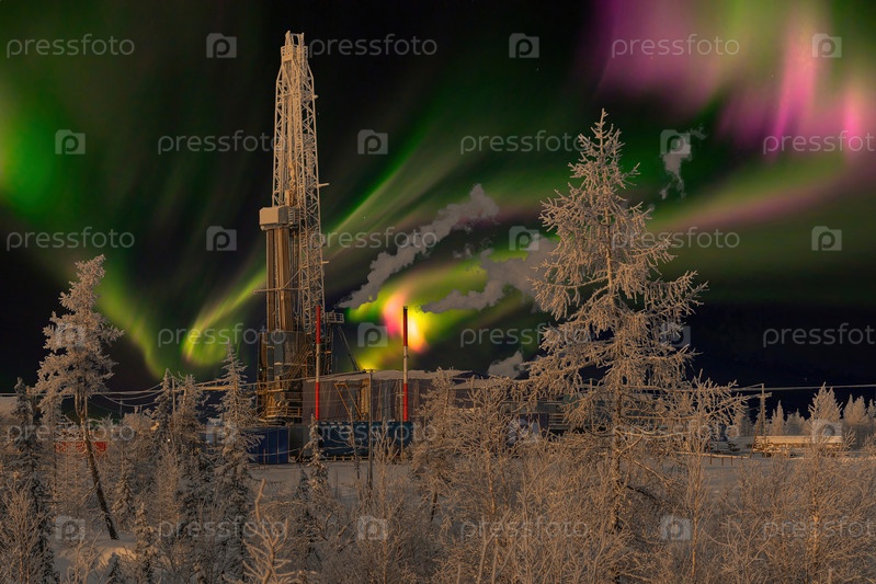 Зимний пейзаж полярной ночью с буровой установкой. Северное нефтегазовое месторождение. На заднем плане красивое небо с северным сиянием