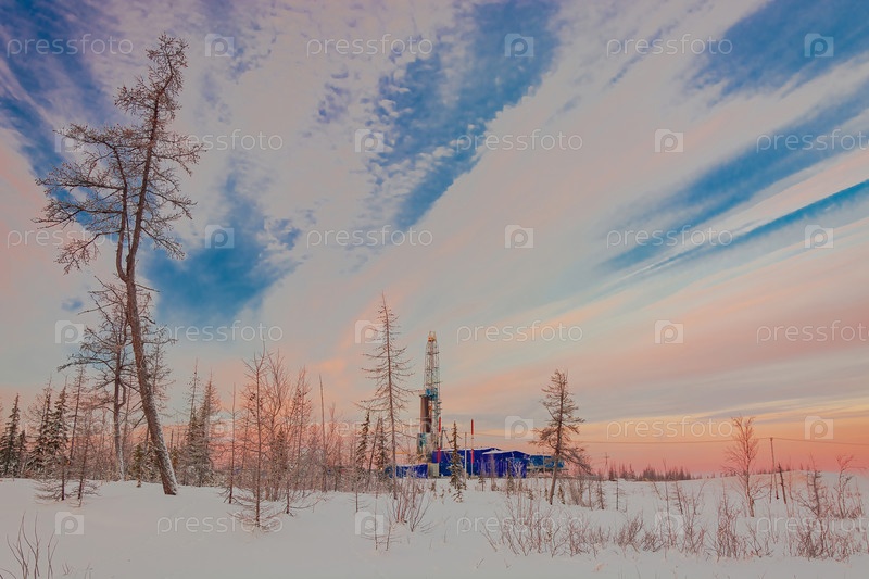 Пейзаж северного ландшафта нефтегазового месторождения с буровой установкой на фоне красивого неба. Зимний полярный день