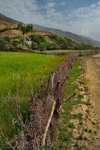 Таджикистан. Деревенский забор из камней и кустарника - традиционный способ разделения земельных участков в высокогорных деревнях