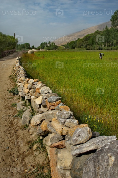 Таджикистан. Деревенский забор из камней и кустарника - традиционный способ разделения земельных участков в высокогорных деревнях